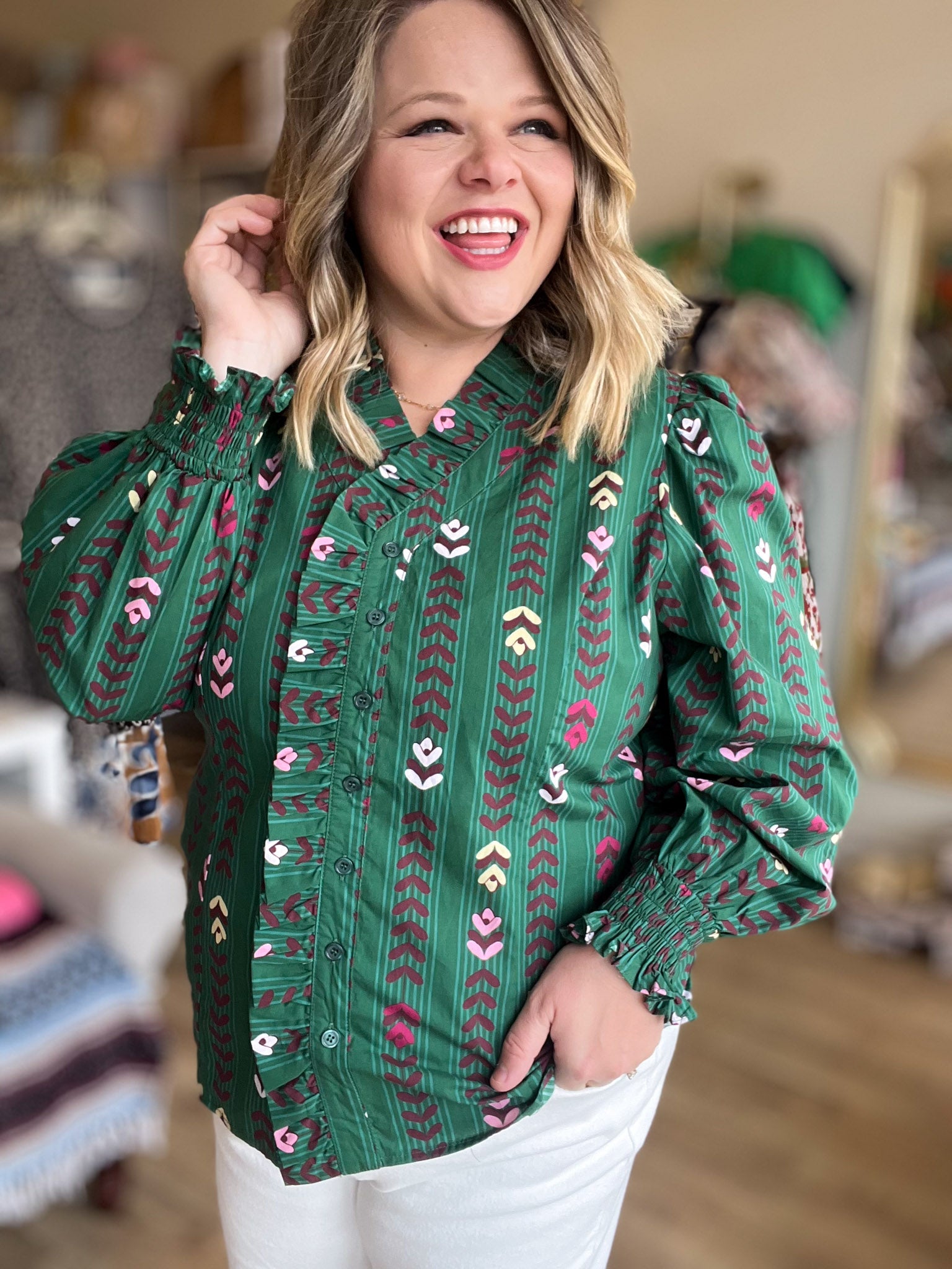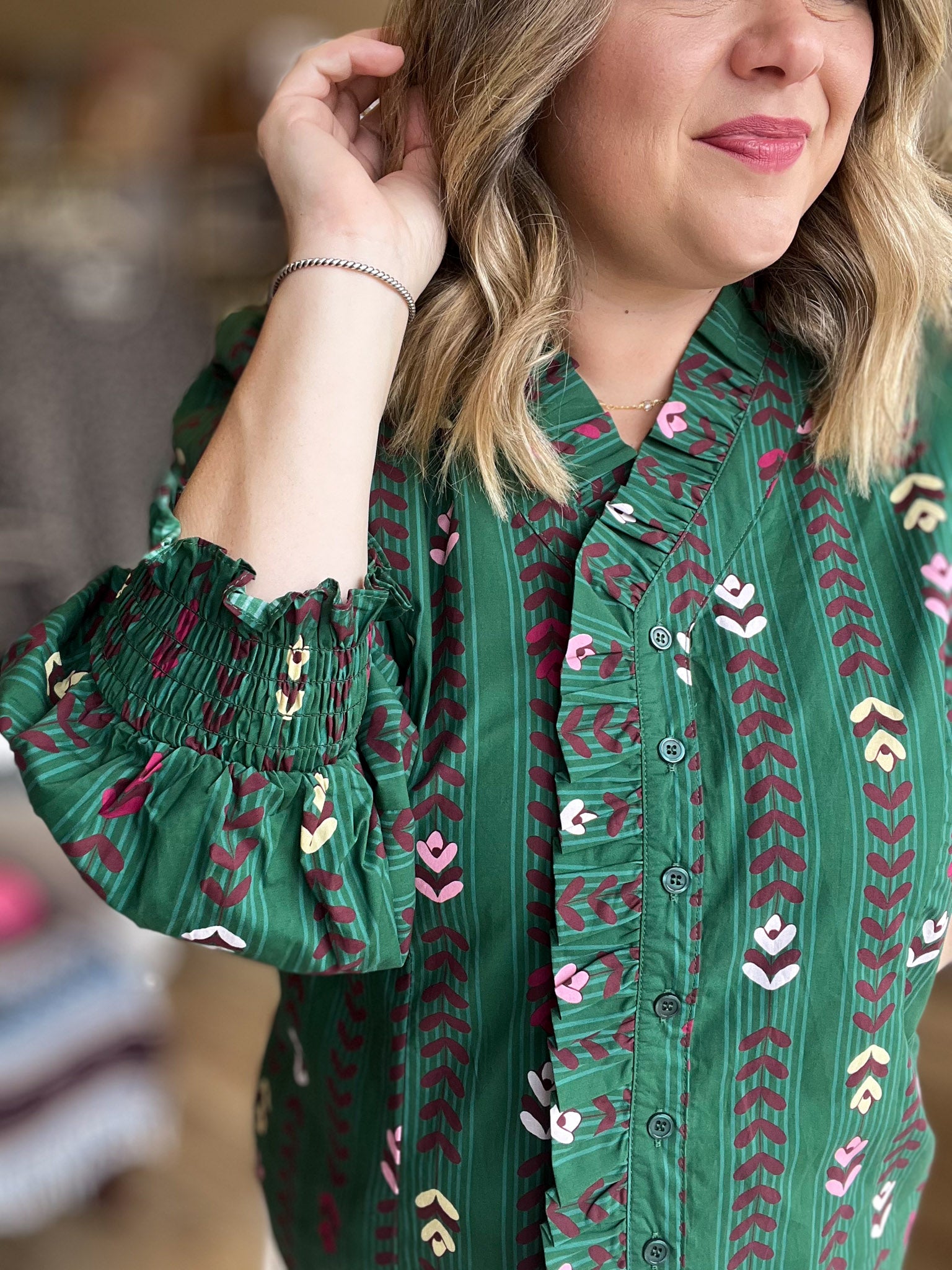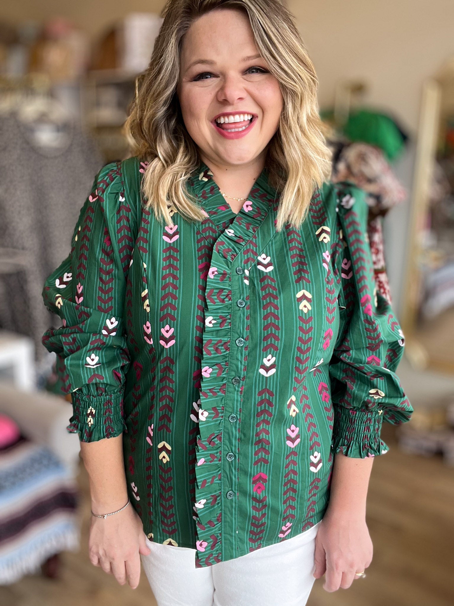 You'll be the epitome of poise in this curvy green floral vine top, now available in XL-2X! This best-selling stunning floral vine pattern is now available in long sleeves. This tailored design features a playful ruffle neckline and ruffle feature along a button front. Smocked wristbands provide versatility, allowing this top to be worn long sleeve or 3/4 sleeve. Make a statement wherever you go with this beautiful forest green color perfect for fall and winter!