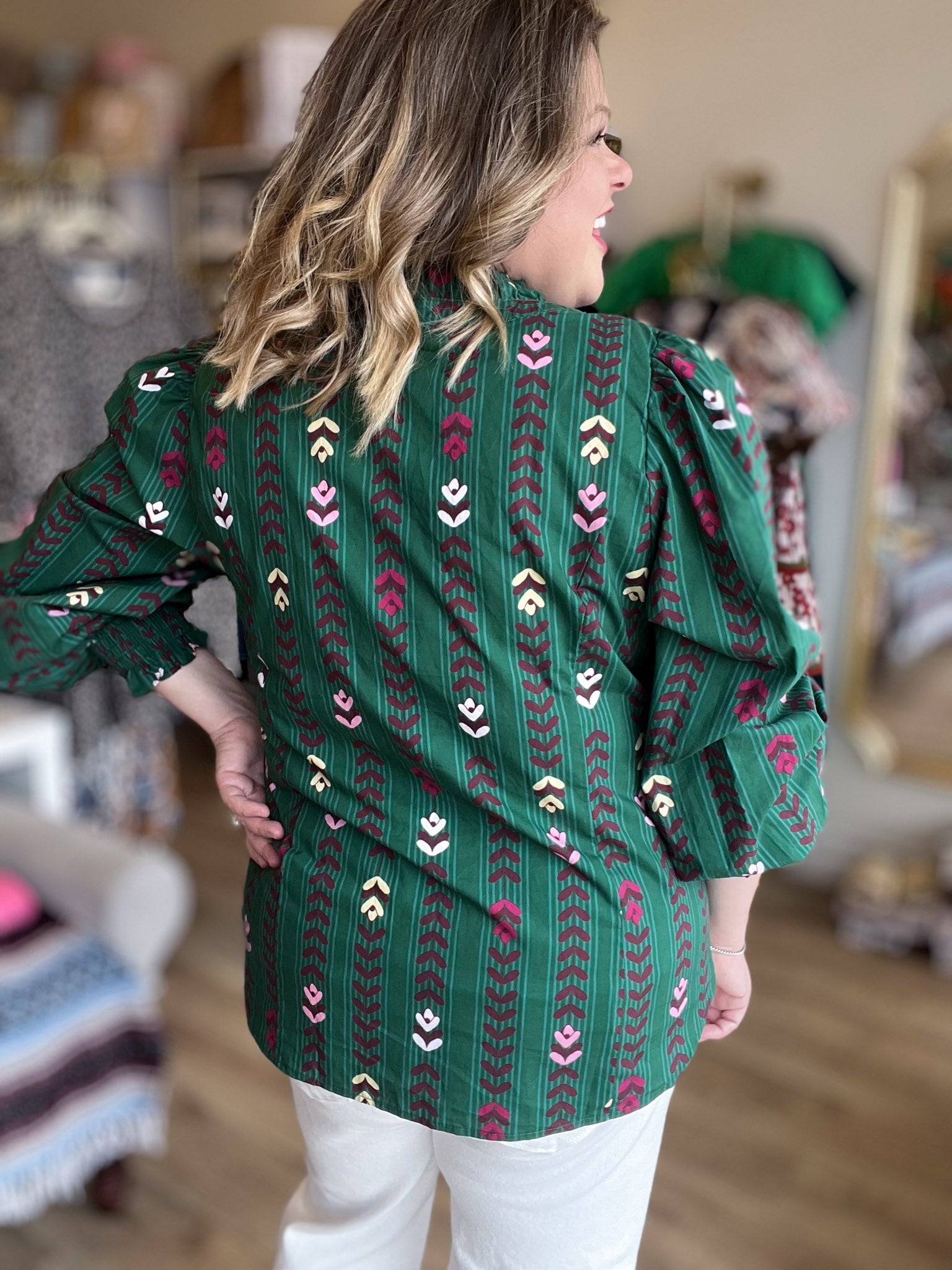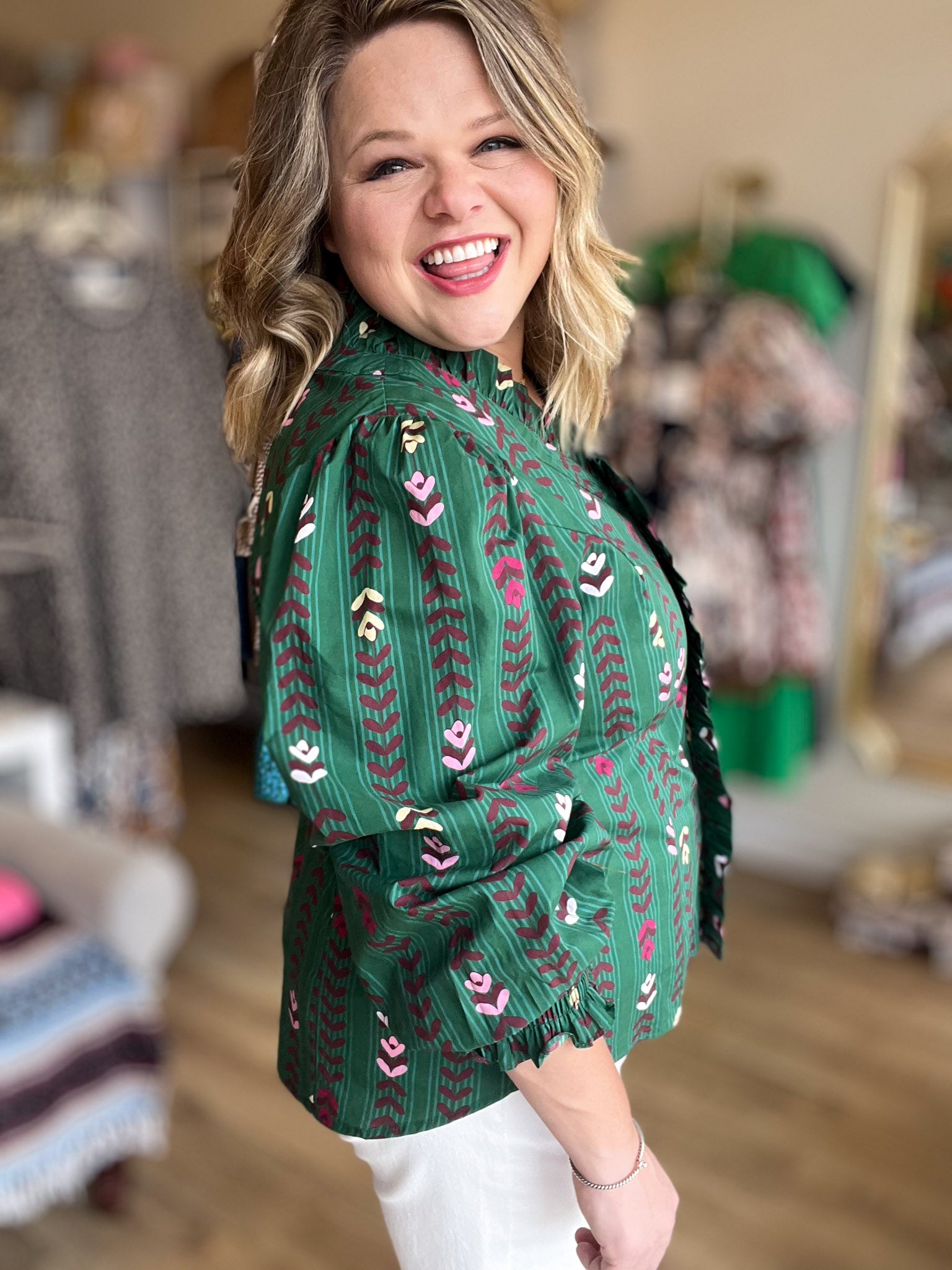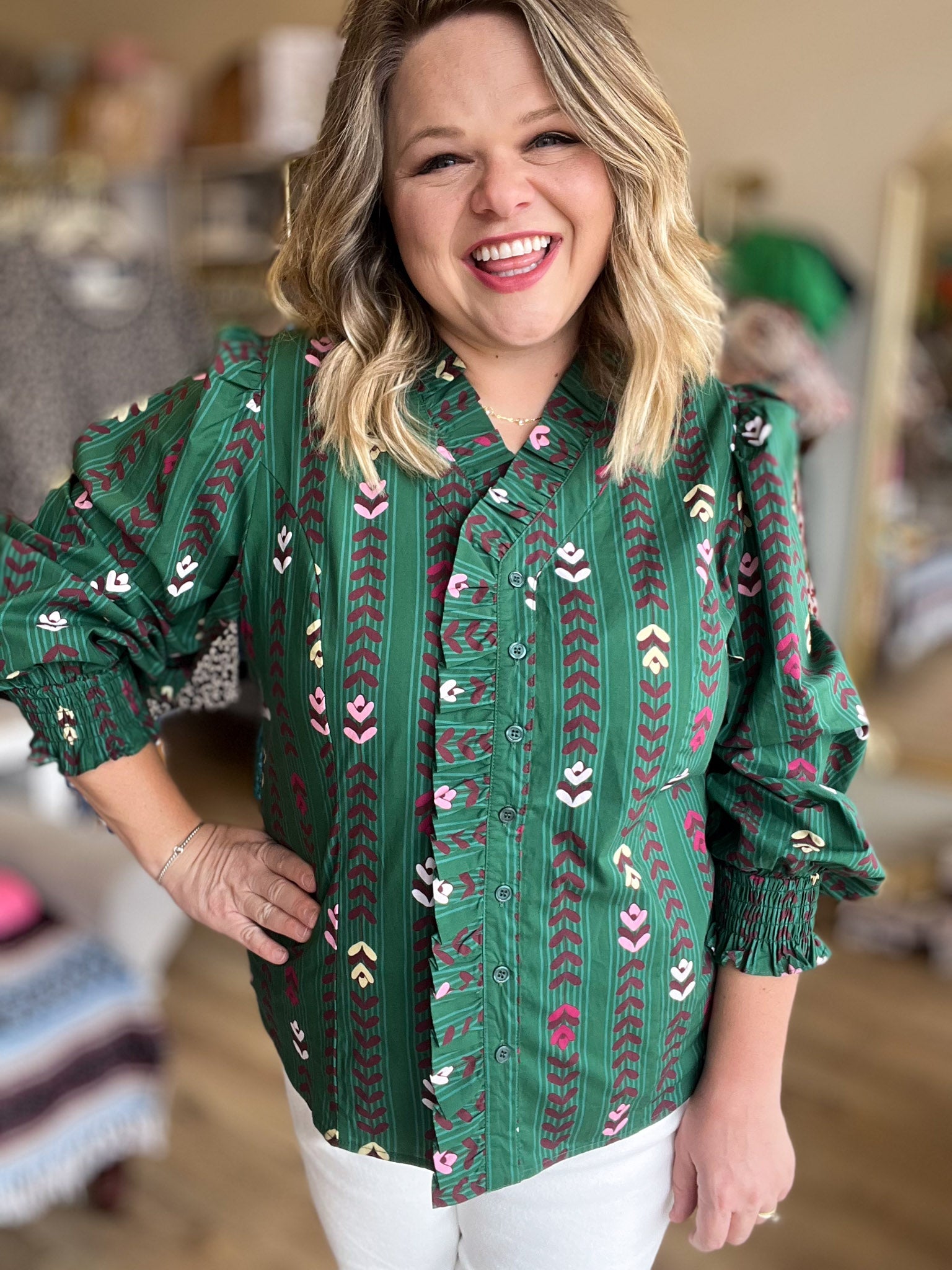 You'll be the epitome of poise in this curvy green floral vine top, now available in XL-2X! This best-selling stunning floral vine pattern is now available in long sleeves. This tailored design features a playful ruffle neckline and ruffle feature along a button front. Smocked wristbands provide versatility, allowing this top to be worn long sleeve or 3/4 sleeve. Make a statement wherever you go with this beautiful forest green color perfect for fall and winter!