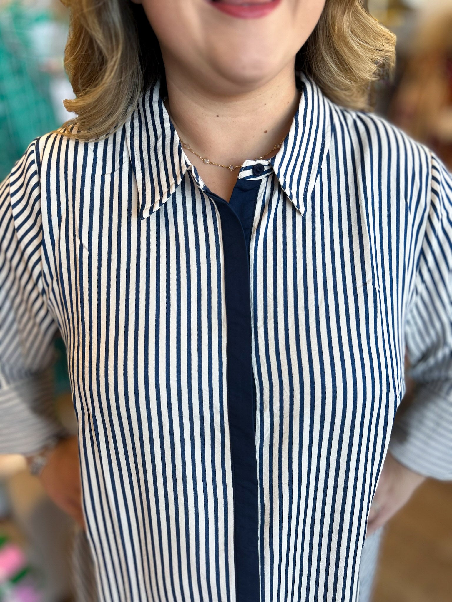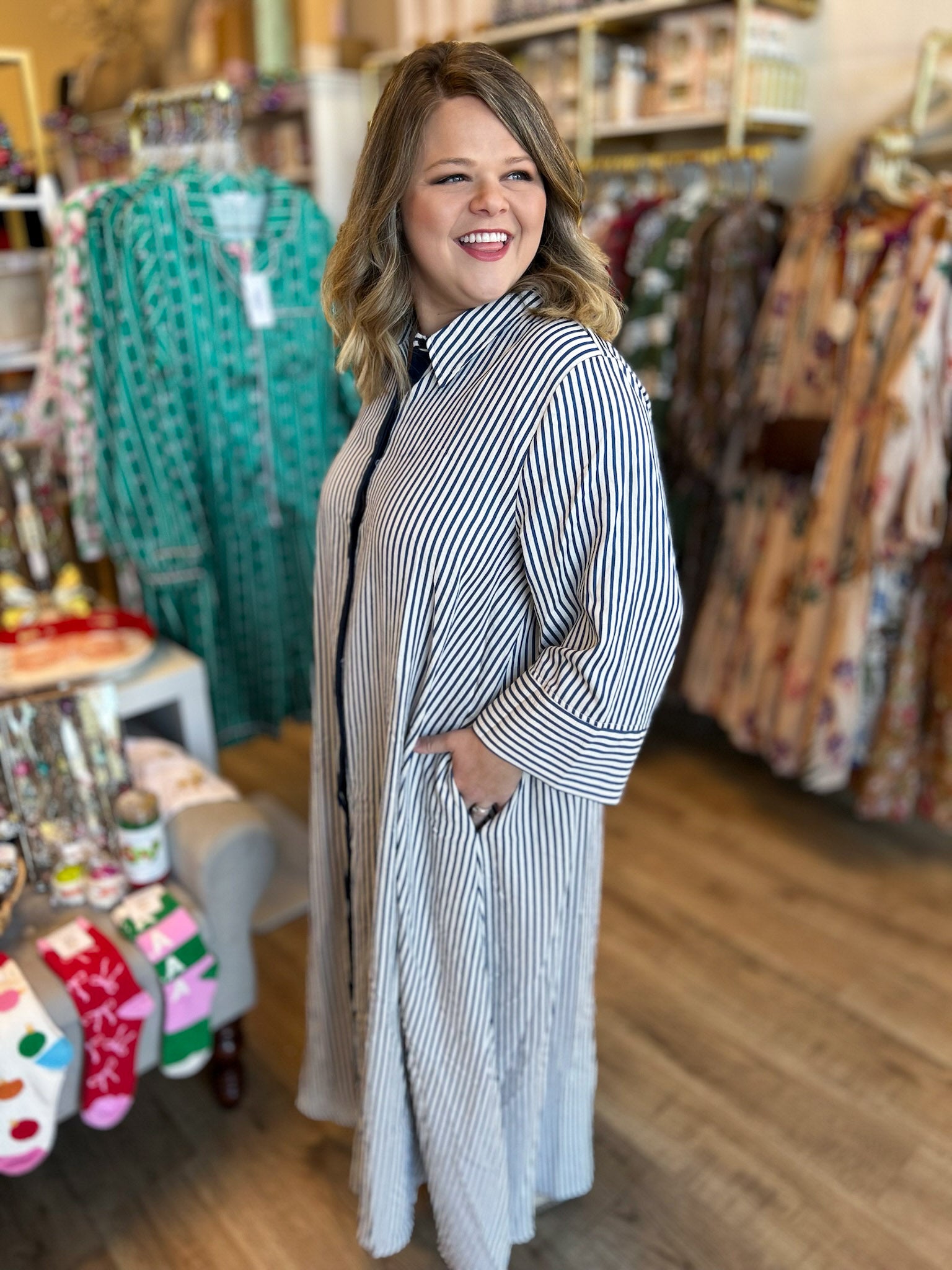 Get ready to turn heads in this fabulous navy striped maxi dress that's all about being effortless and simply stunning. The playful vertical stripes paired with a gracefully flowing silhouette create an instantly chic look that feels both comfortable and confident. Those charming contrast-covered buttons add just the right amount of personality and detail. Add some statement jewelry, or a sleek belt to make it entirely your own. Perfect for anyone who loves a dress that's as fun as it is versatile!
