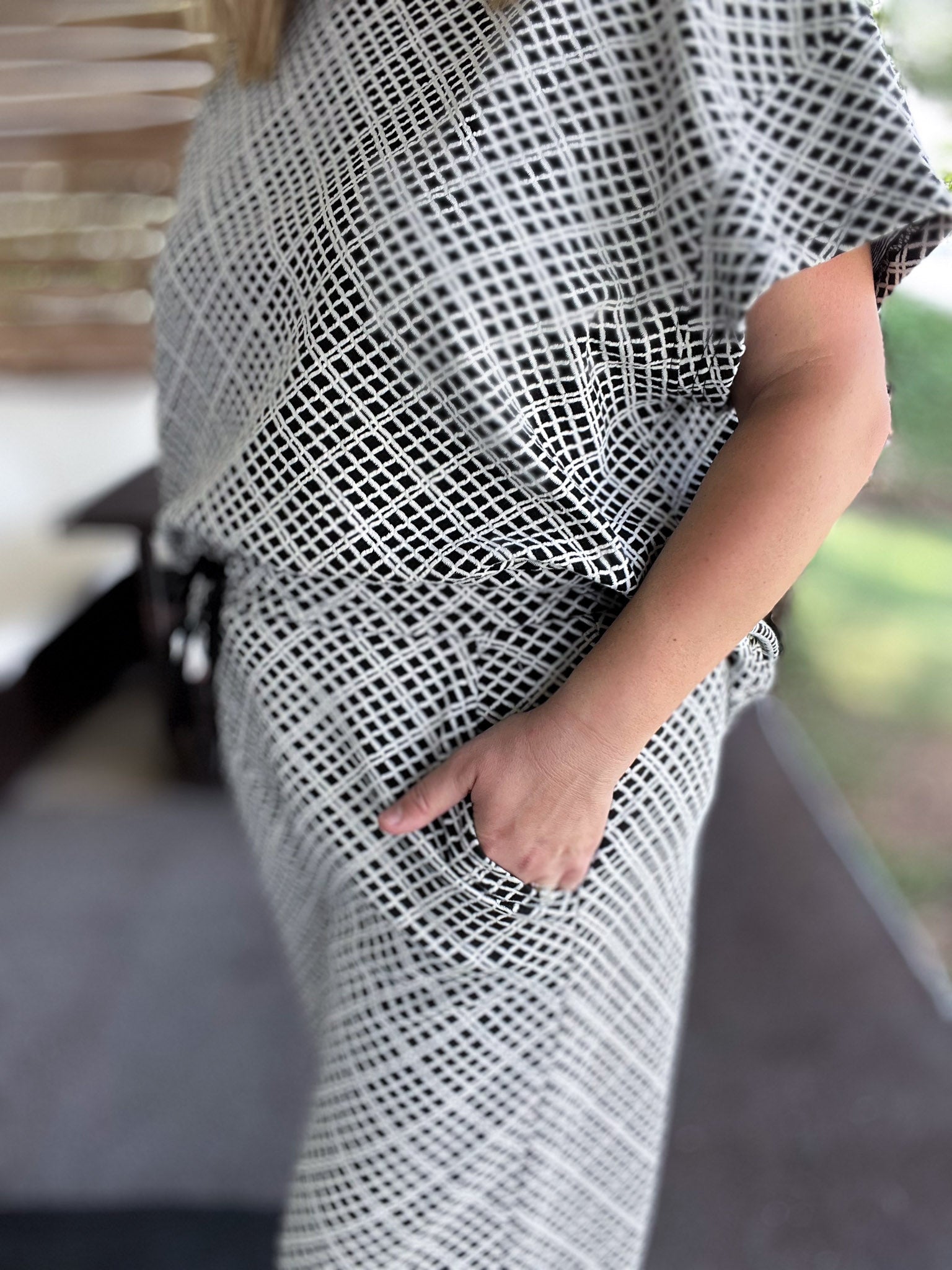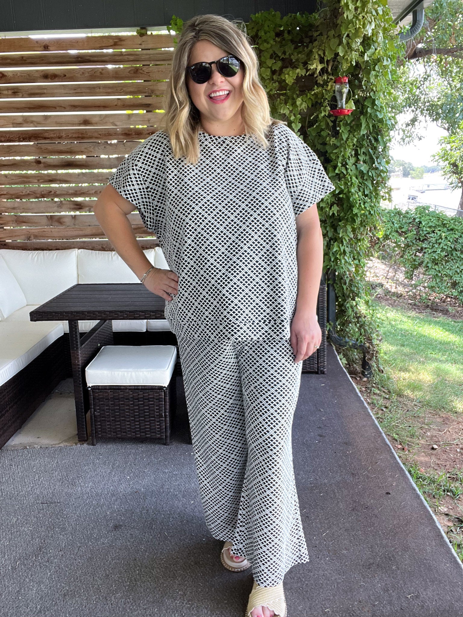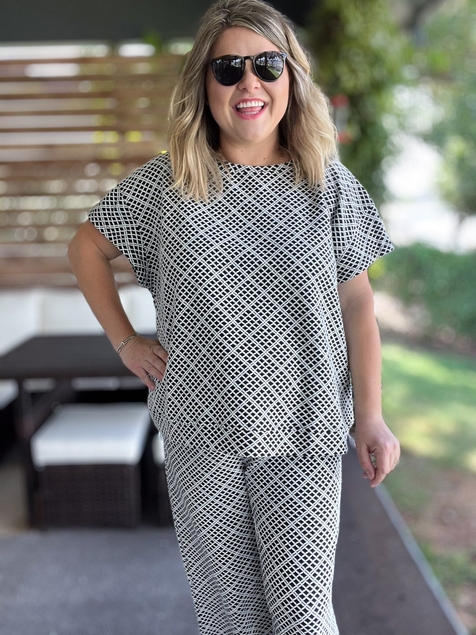 Sets are all the rage right now! Be on trend this season with our Like a Diamond Plus-Size Black & White Set. This trendy black and white diamond pattern and lightweight stretchy will keep you looking stylish and feeling comfortable throughout the Fall season and beyond! Take your loungewear from functional to fashionable with this stretchy and soft wide leg cropped pant set with functional pockets. A plus-size must-have!