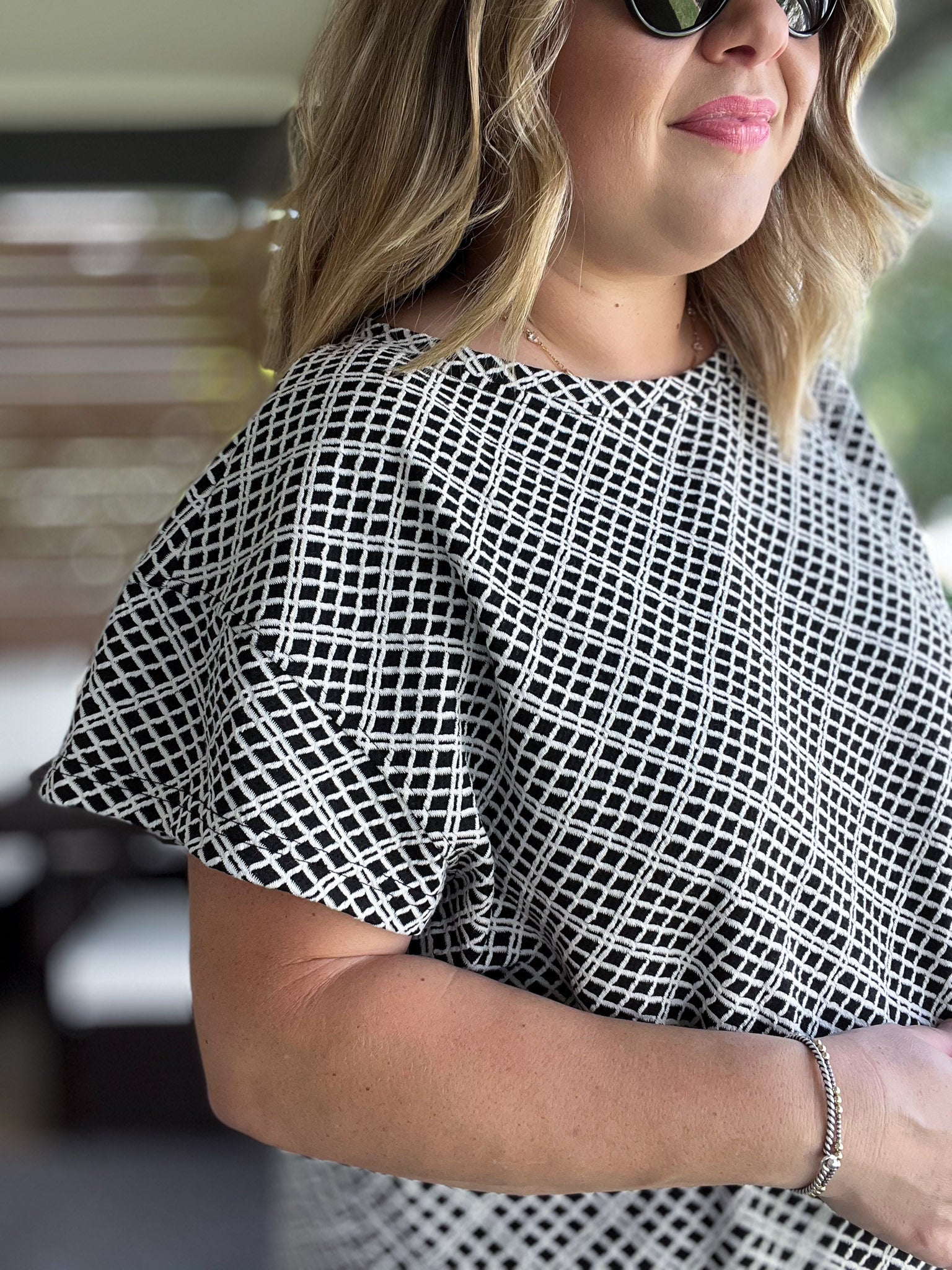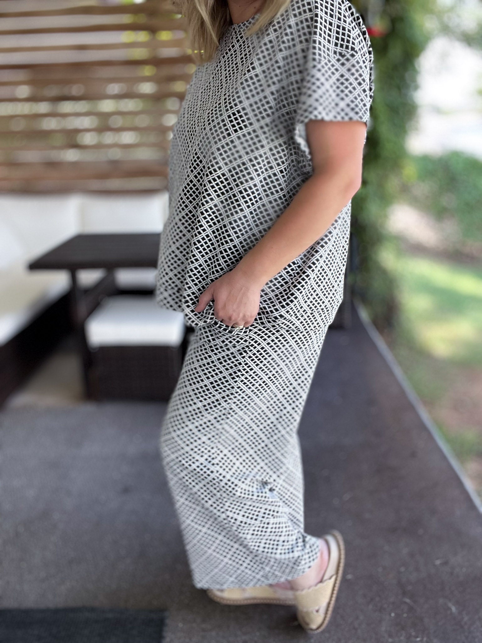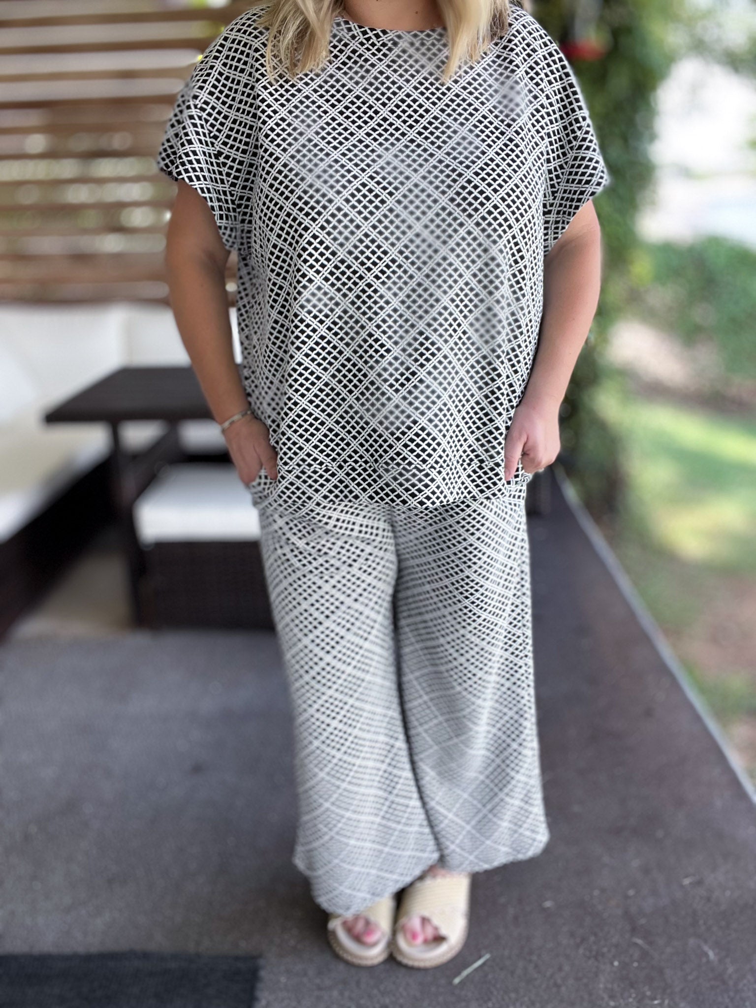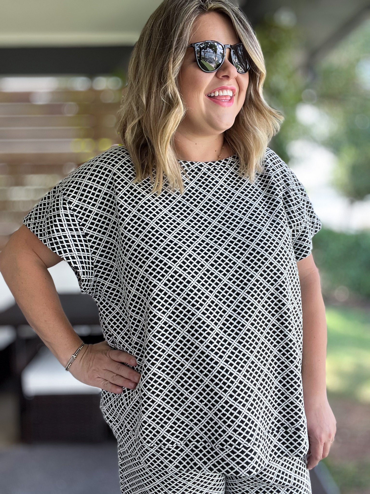 Sets are all the rage right now! Be on trend this season with our Like a Diamond Plus-Size Black & White Set. This trendy black and white diamond pattern and lightweight stretchy will keep you looking stylish and feeling comfortable throughout the Fall season and beyond! Take your loungewear from functional to fashionable with this stretchy and soft wide leg cropped pant set with functional pockets. A plus-size must-have!
