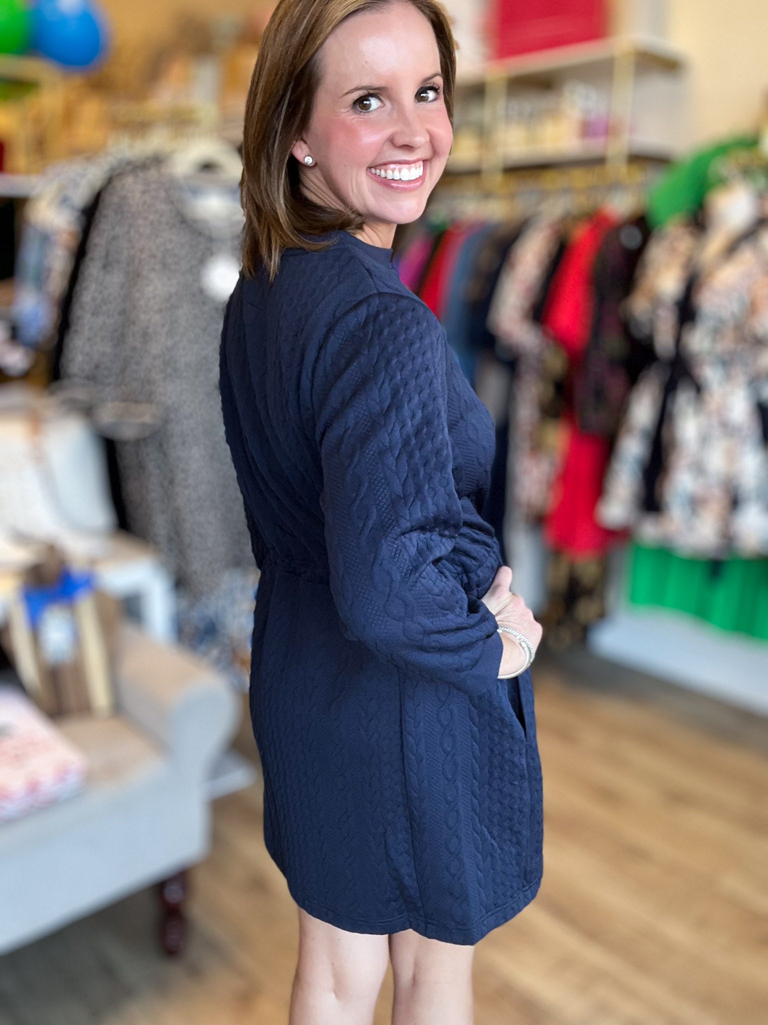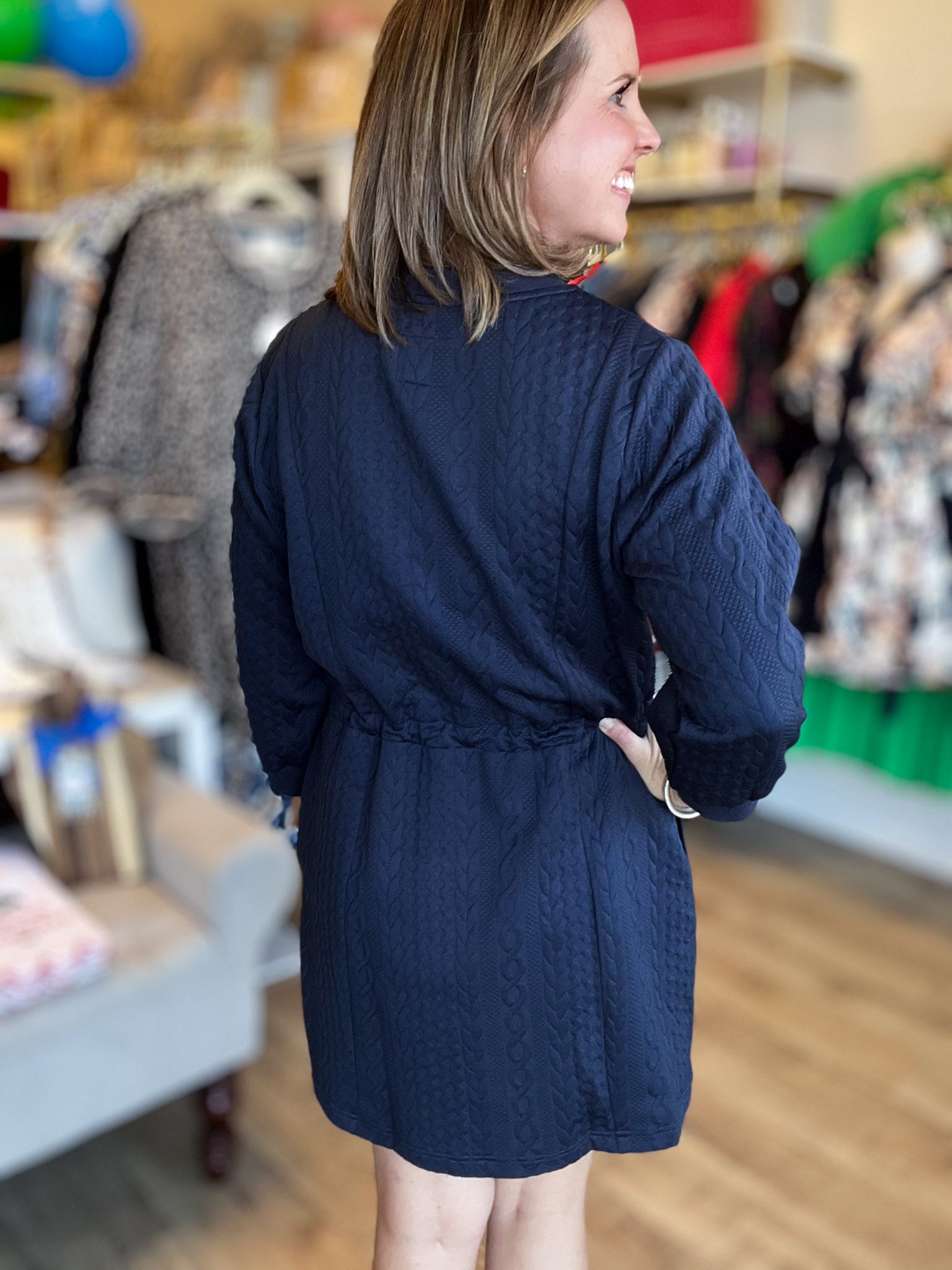 Wrap yourself in cozy charm with the Shore is Stunning Midnight Cable Knit Mini Dress. Featuring a comfy crew neck and long sleeves with snug ribbed cuffs, this dress keeps you seasonally stylish. The playful cable knit texture adds personality, while the adjustable drawstring lets you customize your fit. Practical side pockets add a handy touch without bulk. Perfect for layering or wearing solo, this unlined mini dress is your go-to for laid-back, effortlessly chic days.